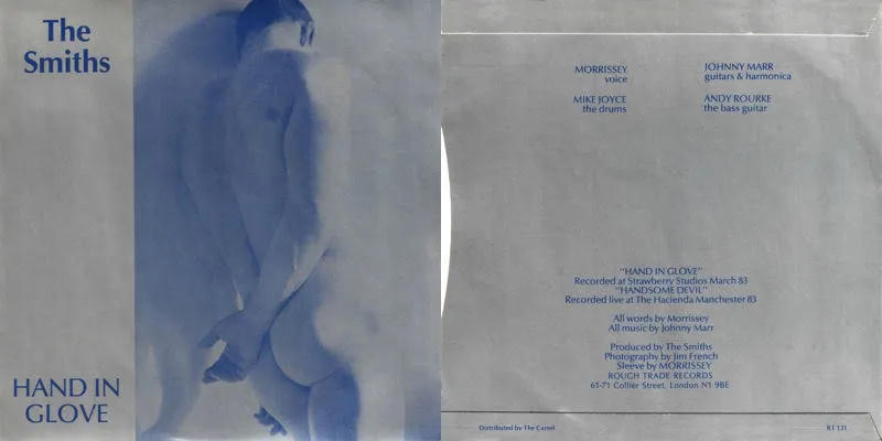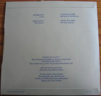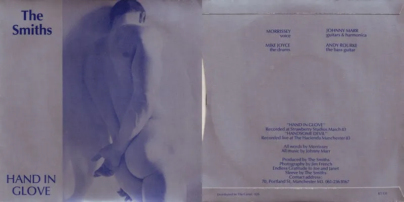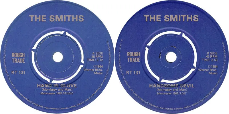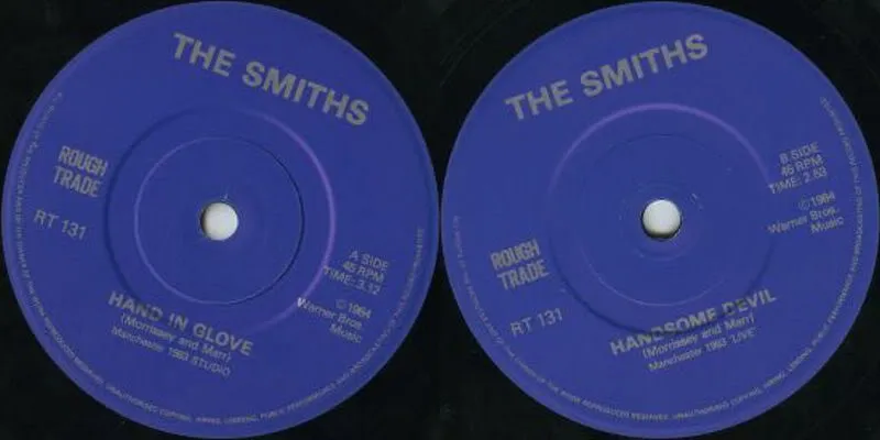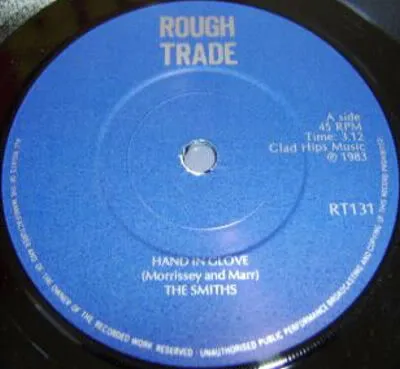 May 1983 Rough Trade RT-131 Hand In Glove b/w Handsome Devil (Live Manchester Hacienda 4/2/1983) 7" single UK Apparently only 25 copies of this negative image sleeve exist |