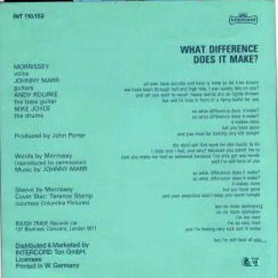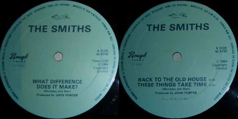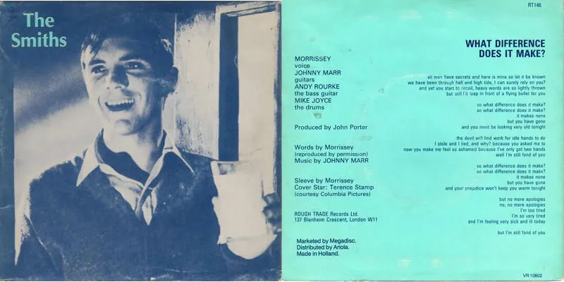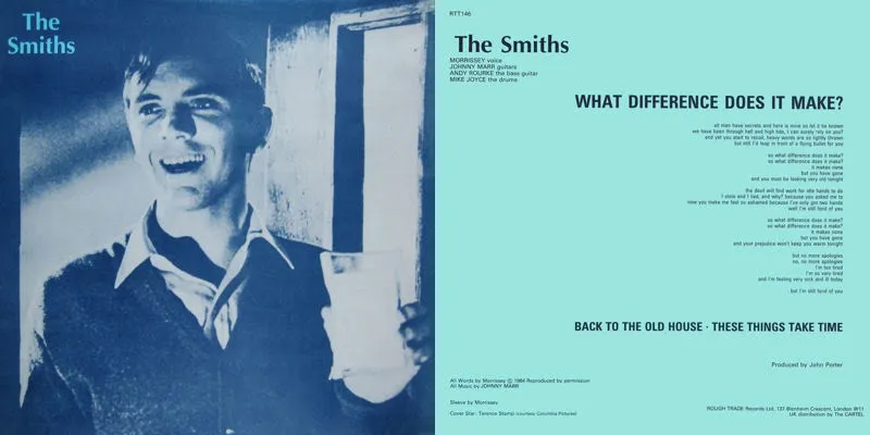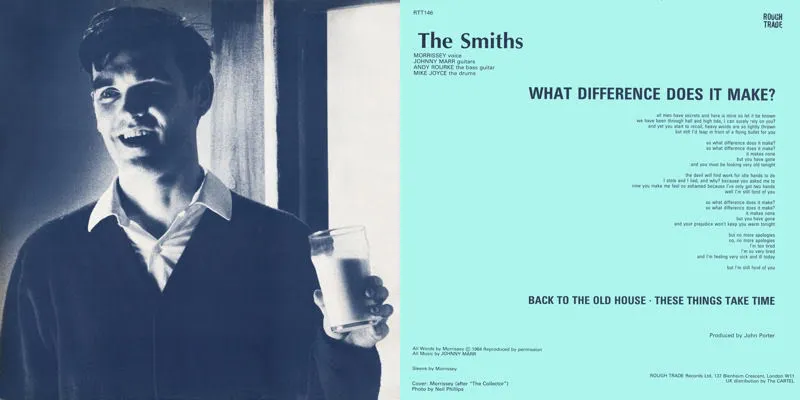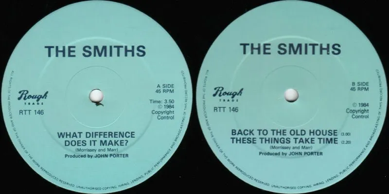 Feb. 1984 Rough Trade RTT-146 What Difference Does It Make b/w Back to the Old House//These Things Take Time 12" single UK Morrissey front cover |