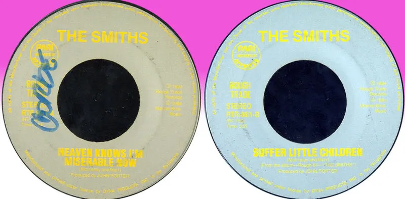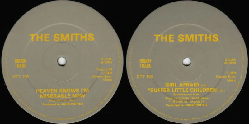 25th May 1984 Rough Trade RT-156 Heaven Knows I'm Miserable Now b/w Suffer Little Children 7" single UK |