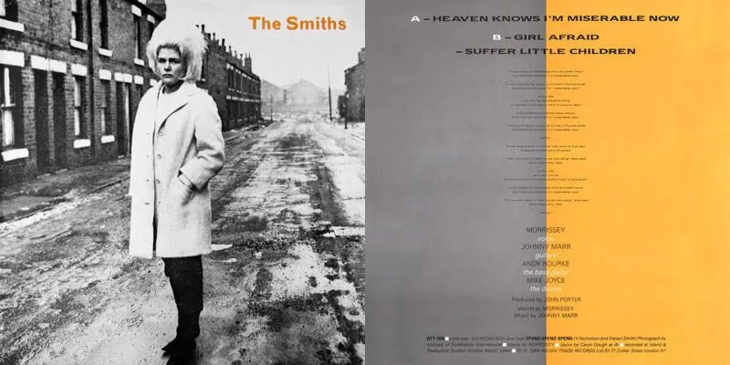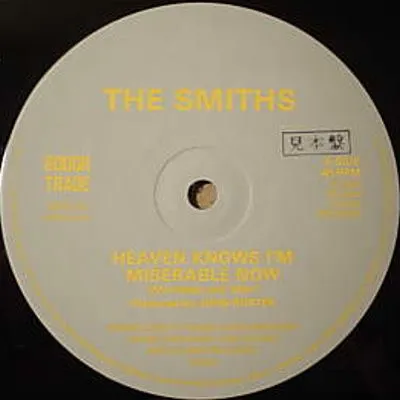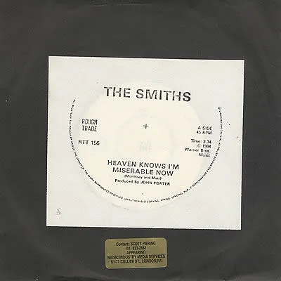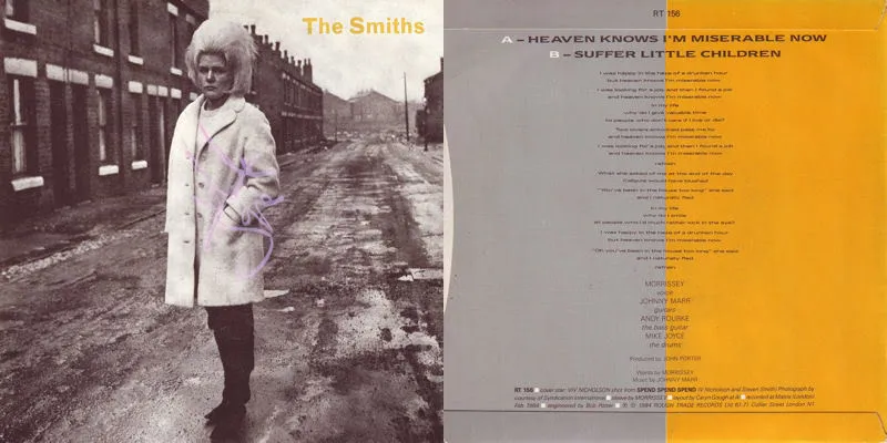 25th May 1984 Rough Trade RTT-156 Heaven Knows I'm Miserable Now b/w Suffer Little Children 7" single UK This was a 7" single but with the 12" label design printed on the front cover |