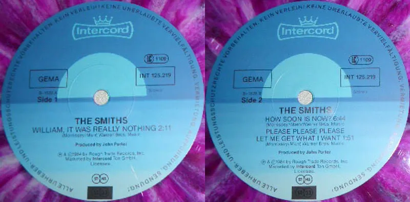 August 1984 Intercord INT-125.219 William, It Was Really Nothing b/w How Soon Is Now // Please Please Please Let Me Get What I Want 12" single Germany |